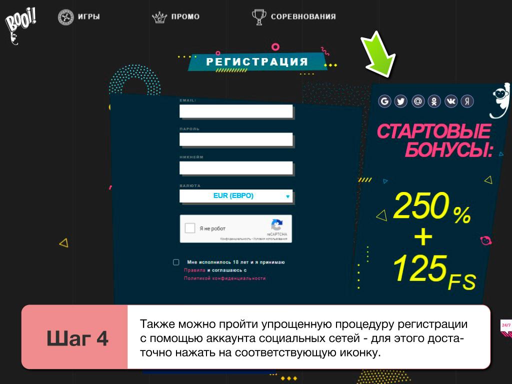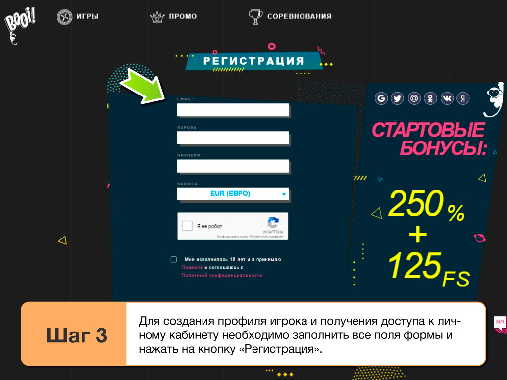 Чтобы играть на деньги в казино Booi в 2025 придется пройти простую процедуру регистрации. Без этого пользователям доступны только бесплатные демо режимы, которые здесь исключительно для ознакомления. Получить реальные выигрыши не выйдет, соответственно стоит сразу же вызывать форму для создания аккаунта. С ее помощью зарегистрироваться можно следующим образом: