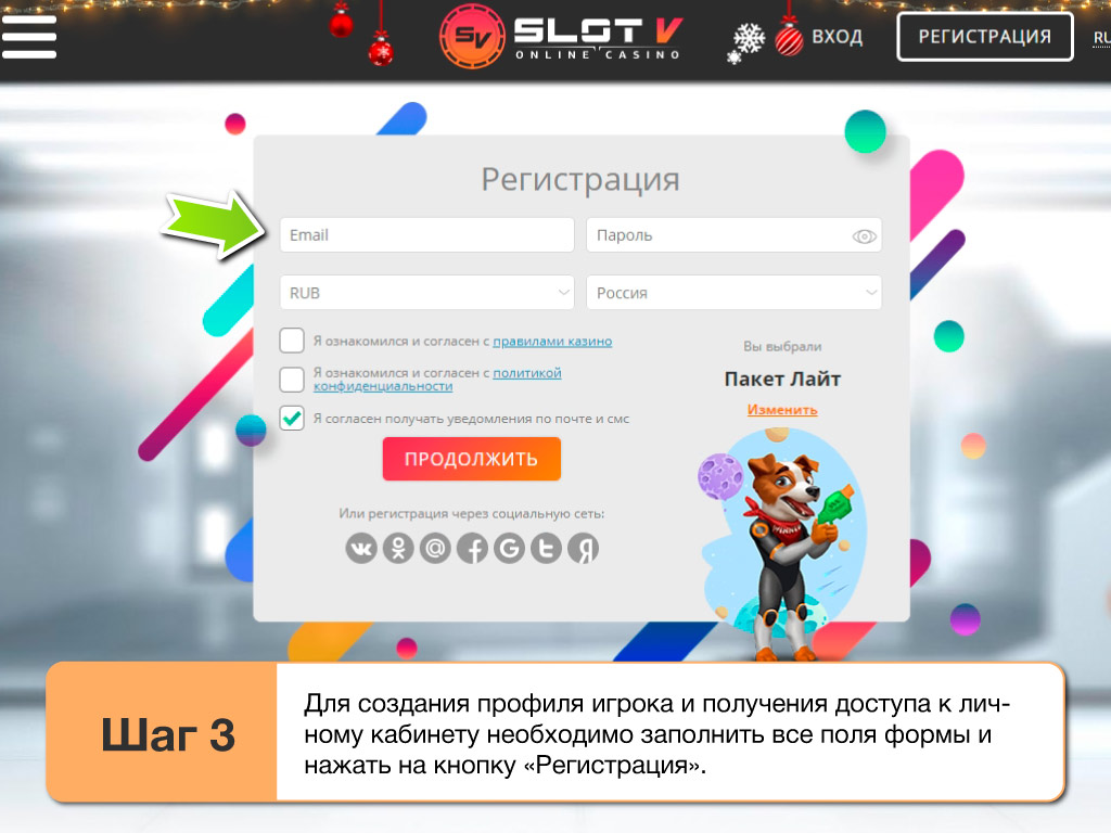 Выбирая на официальном сайте или на актуальных зеркалах SlotV com пункт «Регистрация», новые гости имеют возможность легко зарегистрироваться на площадке. Такая процедура подразумевает: